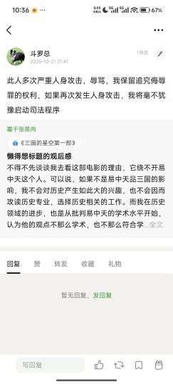 这个影片已经不能用闹心来形容了,影片本身内容差到极致,这一点我在之前的影评里已经详细说明了,这个片子的部分粉丝也是极度不可理喻,评论一句质疑就被用恶言辱骂,辱骂完了之后我被迫反击,他反而成受害者了,真是高,高啊!被骂的人成了加害者,骂人者成了受害者,这本来这影片就是0.5分的影片,现在好感完全败光,0.5分可以四舍五入成0分了!一个自称历史专业的人写的影评里一众标准中权重最低的居然就是历史,情怀占了绝大多数,任何正常人都会质疑,质疑的结果就是从第一句开始就是用脏话谩骂,是可忍孰不可忍?还自称是捍卫自己自由评分的权利,还能拔高到如此程度,你的评论区容不得不同声音就是容不得呗,只发了一句评论就能用脏话辱骂,居然还能弄上看似高尚的理由了。最让人无法理解的就是,我明明一开始只发了一句对他明明褒的部分很少,贬的很多,就质疑这么一句他就骂人,那我当然不干了,最后就话赶话发了40多条评论,但问题是,你一开始能说你是捍卫你自由评分的权利吗?如果不是你不断辱骂,会变成40多条评论吗?会构成现在所谓的对你评分的干涉的表象吗?说到底就是你在干涉我自由评论的权利,并进行网络暴力导致的。另外建议,口才这么好可以用到正道上。 你除了拿法律恐吓还会啥?但问题是这恰恰暴露你对法律一无所知。 来看看我之前转发的文案: